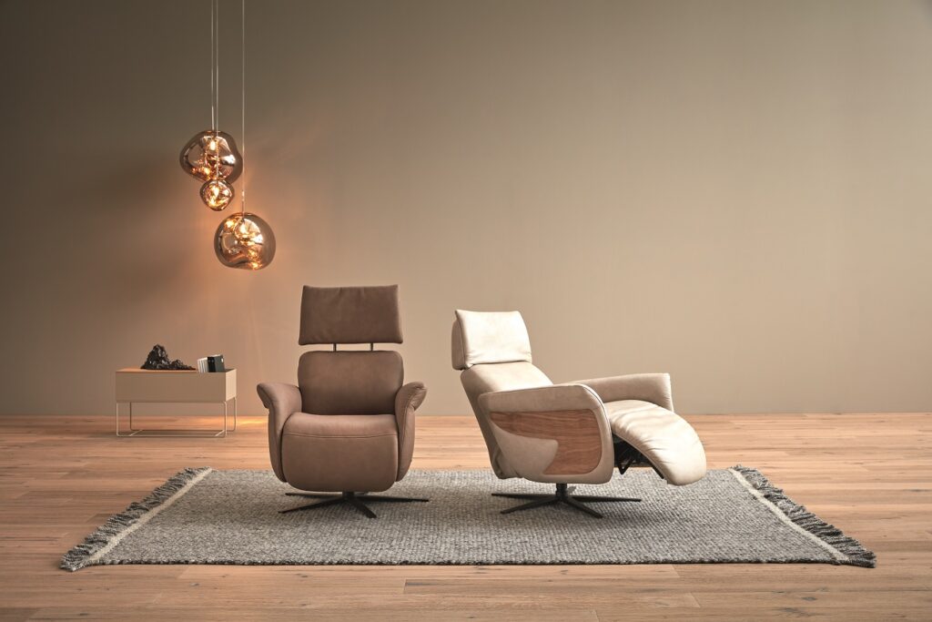 扶手兩款設計被賦予不同的氛圍表達,可選擇純粹的皮革無縫整合成渾然一體的優雅美感,亦可選擇崁入式溫潤的木質側板,形塑充滿質感和溫度的視覺效果。略帶粗曠的鋼材腳架支撐,座椅彷彿漂浮其上,沉重的量體瞬間變得輕盈。功能層面上,升降式頭枕可調整高度與傾斜角度吻合頭頸部的支撐;椅背與腳蹬的連動式延展為廣受歡迎的Wall Free模式,由坐至臥隨心所欲且可具體節省前後預留空間。此款型亦可選配心律平衡功能,感受無重力的舒適坐感。